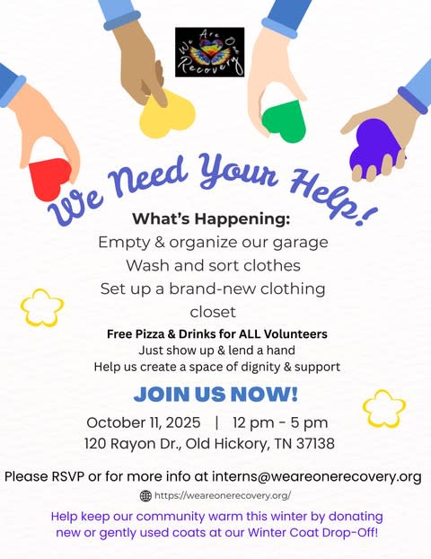 Support We Are One Recovery on Oct 11, from 12-5pm by offering your volunteer services.