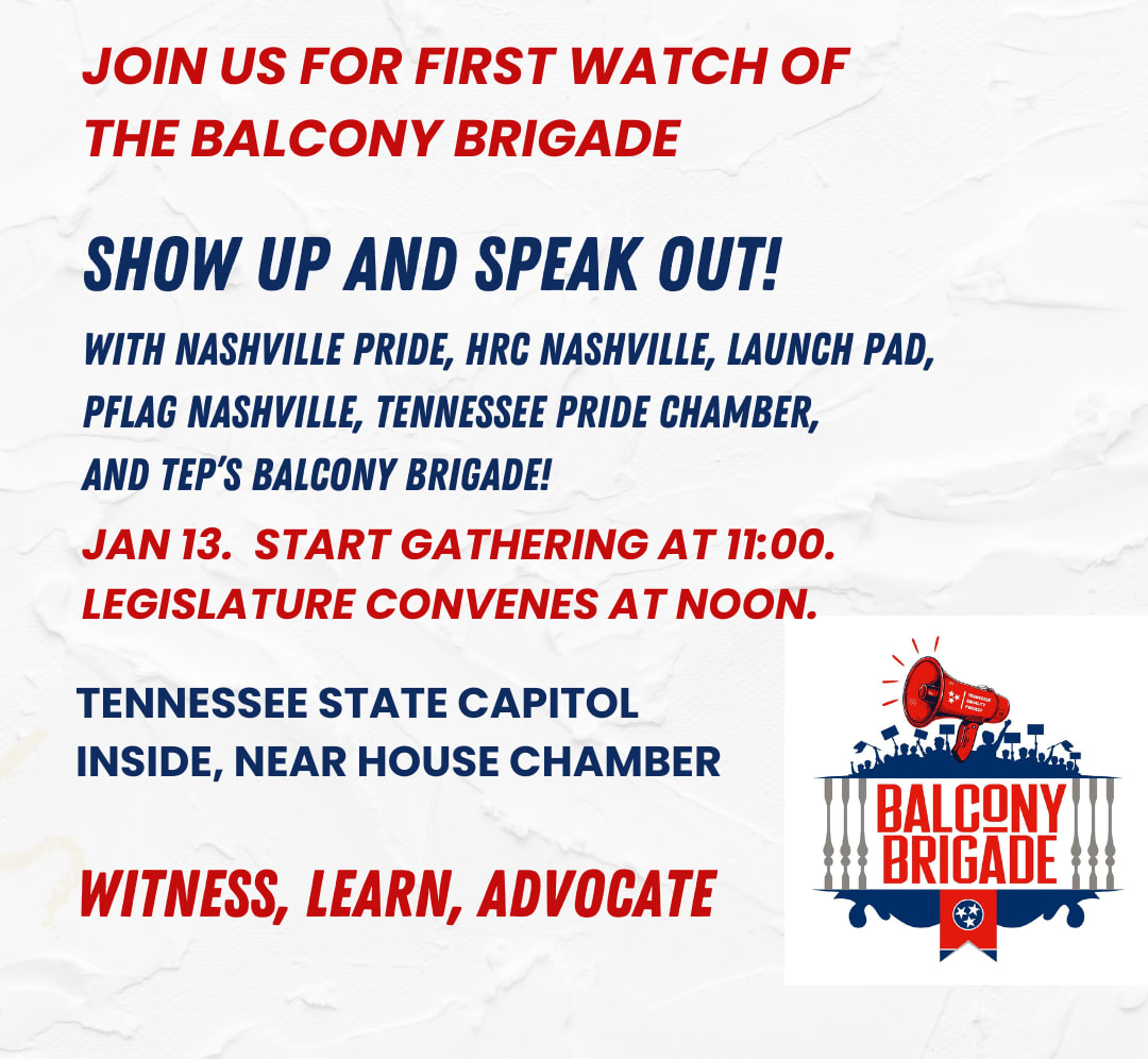 Show up and speak out with Nashville Pride, HRC Nashville, Launch Pad, PFLAG Nashville, Tennessee Pride Chamber and TEP's Balcony Brigade. Legislature convenes at noon, so we'll start gathering at 11:00AM inside the Tennessee State Capitol, near the house chamber.