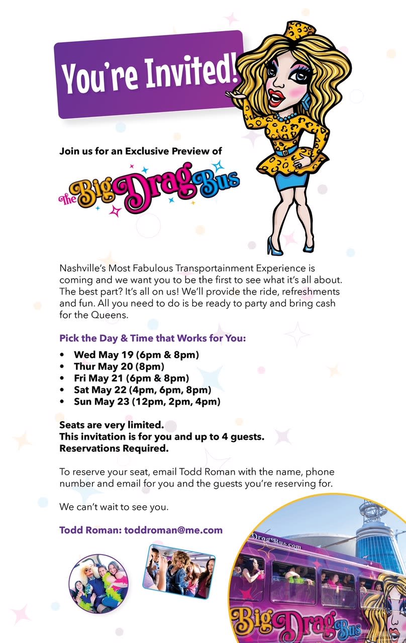 Nashville's Most Fabulous Transportainment Experience is coming and we want you to be the first to see what it's all about. The best part? It's all on us! We'll provide the ride, refreshments and fun. All you need to do is be ready to party and bring cash for the Queens.