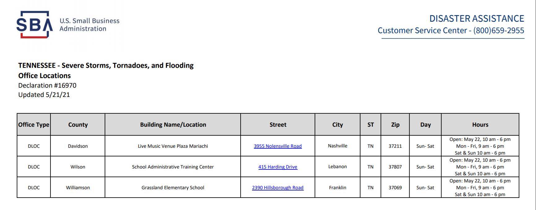 These are three (3) physical locations in Nashville, in Lebanon, and in Franklin where residents, nonprofits, and business owners (and possibly, in some case, employees whose personal property was damaged) can get direct help from the SBA ODA/Ofc of Disaster Assistance staff for the above disaster declaration. The physical locations open on May 22 2021.