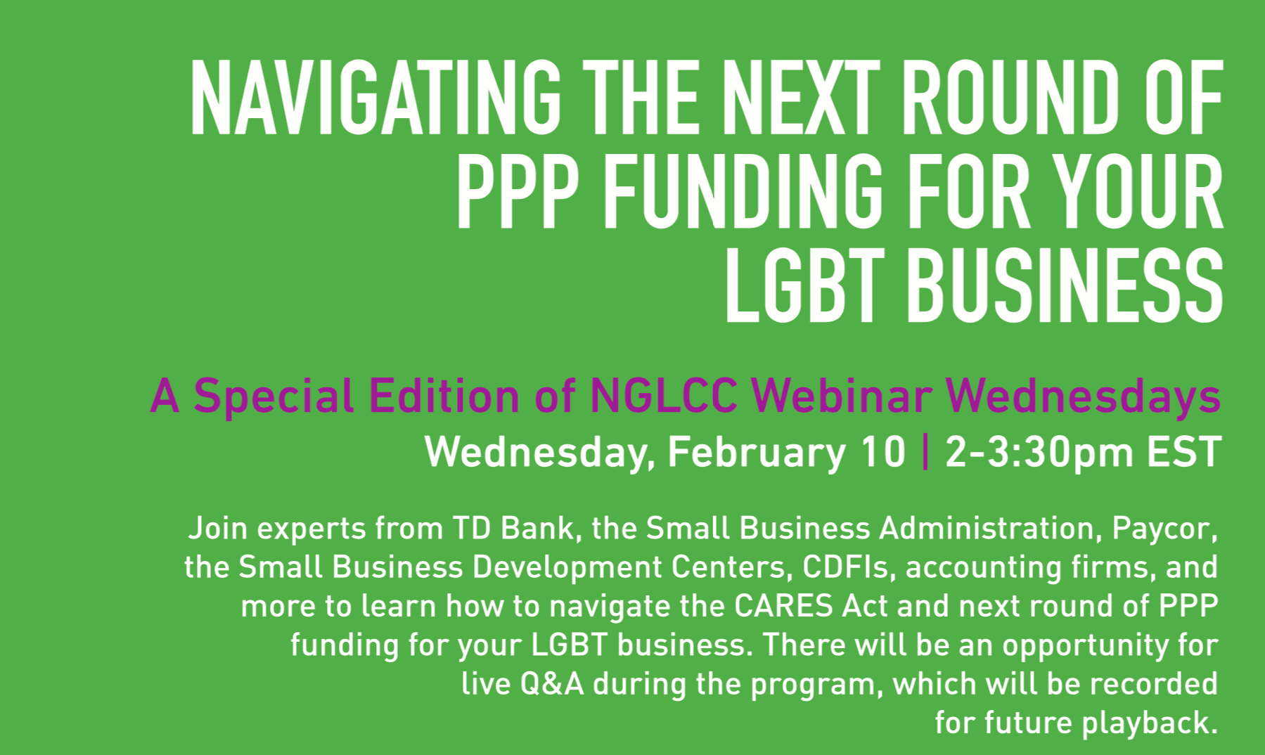 Join NGLCC, our affiliate chambers, as well as experts from TD Bank, the Small Business Administration, Paycor, the Small Business Development Centers, CDFIs, accounting firms, and more to learn how to navigate the CARES Act and the next round of PPP funding for your LGBT business. There will be an opportunity for live Q&A during the program, which will be recorded for future playback.